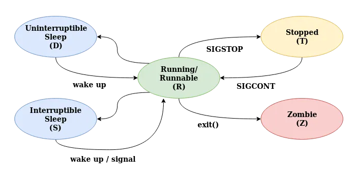 - 중단 상태(stopped) : 프로세스 중단 시그널(SIGSTOP)을 받아 프로세스가 멈춘 상태이다. 이 상태에서 프로세스 재시작 시그널(SIGCONT)을 받으면 다시 실행 상태가 될 수 있다.