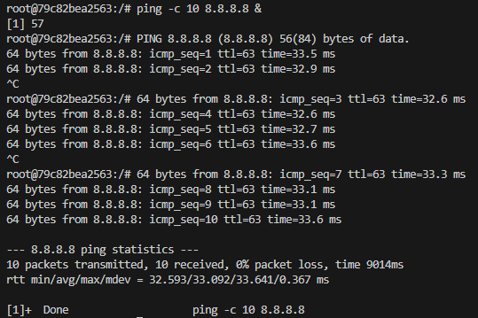 -c 옵션으로 횟수를 10번으로 늘리고 실행하자. 그리고 실행 이후에 Ctrl + z 명령어를 입력해서 프로세스를 중단시키자.