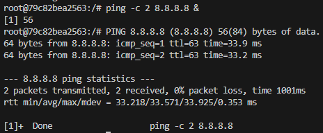포어그라운드 프로세스로 실행핬을 때와 다른 점을 확인할 수 있다. 프로그램을 백그라운드로 실행하면 바로 다음 줄에 실행된 프로세스가 작업 번호 ([1])와 PID(56)가 출력되고, 바로 새로운 프롬프트가 뜬다. 그 뒤로 ping 명령어의 출력 텍스트가 화면에 출력되고 수행한 후에 실행이 종료된다. 이후 아무 일도 일어나지 않은 채 커서만 깜빡인다. 이때 Enter를 누르면 작업 번호 1번 프로세스가 종료됐다는 메시지가 나오고, 새로운 프롬프트가 뜬다. 백그라운드 프로세스가 종료됐음을 보여주는 메시지이다.