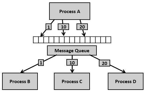 메시지 큐(message queue)는 정해진 큐에 메시지를 넣고 빼는 방식으로 데이터를 교환한다. 큐는 먼저 들어간 데이터가 먼저 나오는 선입선출(FIFO, First In First Out) 방식으로 작동하는 자료구조이다. 메시지 큐는 메시지 단위로 데이터를 전송할 수 있고, 작은 메시지를 교환할 때 성능이 좋다. 특정 프로세스가 메시지 큐를 점유하는 형태가 아니어서 여러 프로세스가 하나의 메시지 큐를 이용해 데이터를 교환할 수도 있다.