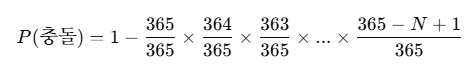 - N명이 있을 때, 모두 다른 생일 가질 확률을 계산 후 1 - P로 같은 생일을 가질 충돌 확률을 구함