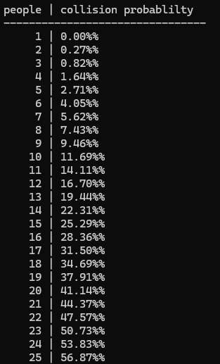 Console.WriteLine($"people | collision probablilty");