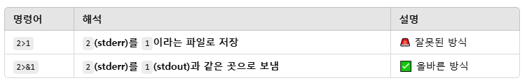 - 2>&1 표준 에러(stderr = 2)를 표준 출력(stdout = 1)과 동일한 위치로 보냄