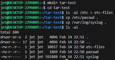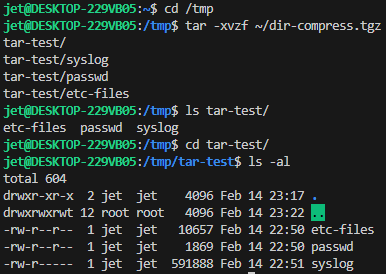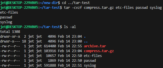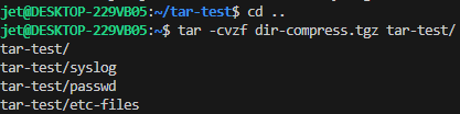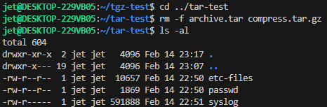파일 단위뿐만 아니라 디렉터리 단위로도 아카이브와 압축을 진행할 수 있다. tar-test 디렉터리로 돌아와서 앞에서 실습하며 생성한 archive.tar 파일과 compress.tar.gz 파일을 삭제한다.