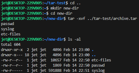 생성한 아카이브 파일을 이번에는 다른 디렉터리에 풀어보자. 먼저 홈 디렉터리로 가서 new-dir이라는 디렉터리를 새로 생성한다. new-dir 디렉터리에 진입해 아카이브 파일을 해제한다. 해제할 때 -x 옵션으로 아카이브 파일 해제를 명령하고, -f로 해제할 아카이브 파일을 지정한다. -v 옵션을 주면 아카이브 파일에서 해제되는 파일들의 이름을 확인할 수 있다.