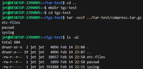 이제 압축한 파일을 해제해 보자. 홈 디렉터리에 tgz-test 디렉터리를 새로 만든다. tgz-test 디렉터리로 가서 -z 옵션을 추가해 압축을 해제한다.