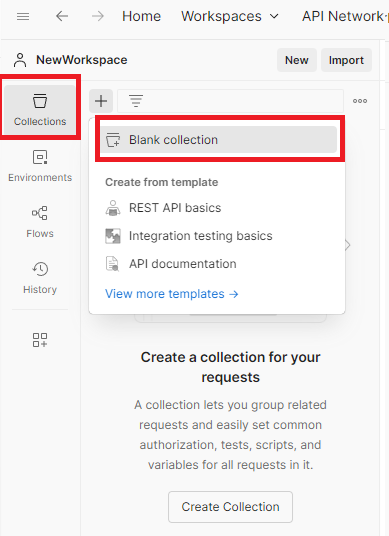 Workspace 하위에 Collection도 생성해 준다. Collection은 윈도우에서 폴더를 생각하면 이해가 빠르다. Collection을 생성하기 그 하위에 개별 요청들을 추가해 주도록 하자.