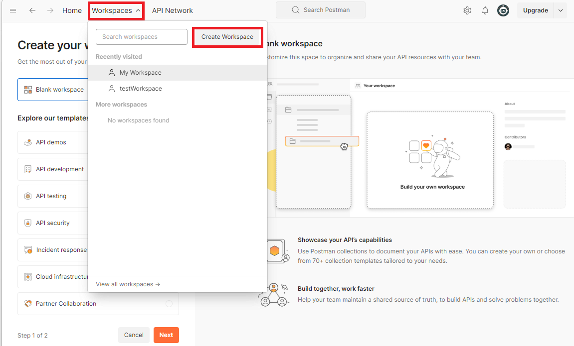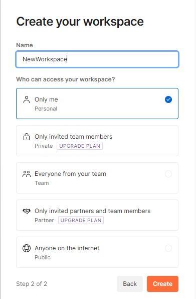 우선 Create Workspace 버튼을 눌러서 새로운 Workspace를 만들어주자.