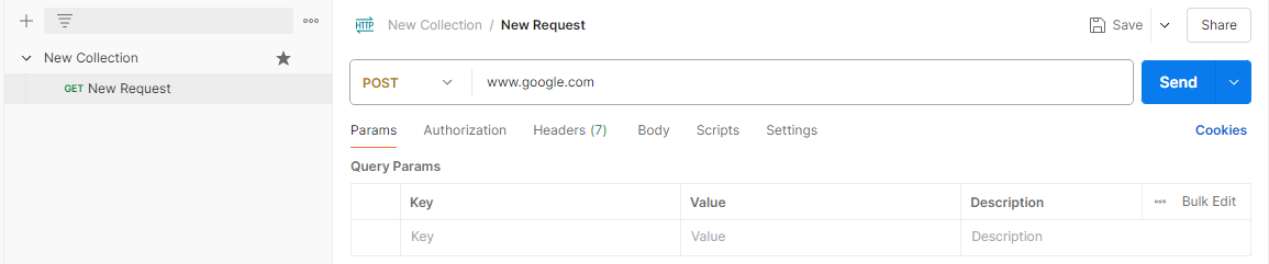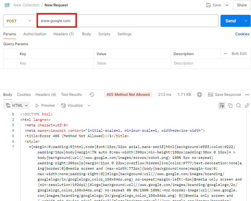 이제 API 타입을 POST로 바꾸고 www.google.com로 POST 요청을 보내보자.