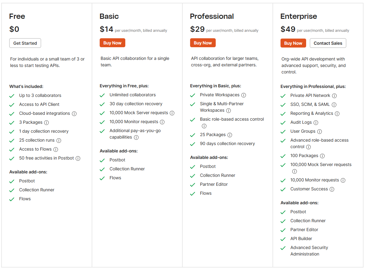 포스트맨을 사용할 때 무료 버전으로도 충분히 API를 호출하고 테스트가 가능하다. 보통은 협업을 위해서 요금제를 사용한다고 생각한다. API 호출 제한이나 환경 변수 사용 제한이 없기 때문에 요금제에 변경이 일어나지 한 편하게 사용하도록 하자.