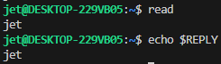read 명령어 뒤에 문자열을 입력받을 변수 이름을 지정하면 해당 변수에 입력한 문자열이 저장된다. 이때 REPLY 변수의 값은 변경되지 않는다.