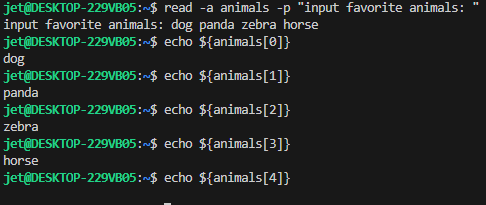-a 옵션을 사용하면 입력한 문자열을 인덱스 배열에 저장할 수 있다. -a 옵션 바로 뒤에 배열 변수 이름을 입력하면 된다. 문자열은 공백으로 구분한다.