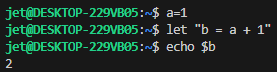 Bash는 모든 변수를 문자열로 해석하기 때문에 우리가 원하는 2이라는 결과가 나오지 않는다. 2를 얻기 위해서 산술연산을 해야하는데, 가장 쉬운 방법은 let 명령어를 사용하는 것이다.
