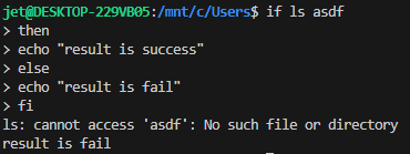 if 문의 조건인 ls asdf 명령이 실패하면서 'asdf'라는 파일이 없다는 에러 메시지가 출력된다. ls asdf 명령이 실패하고 종료 코드는 2가 된다. 따라서 if 문은 else 부분의 명령을 실행해 'result is fail' 메시지를 출력한다.
