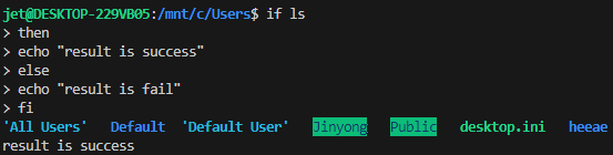 명령어를 실행하지 않고 다음 줄로 넘어가기 위해서는 Shift + Enter를 입력하면 된다. 셸에서 직접 if 문을 작성하기 어렵다면 스크립트 파일로 만들어서 실행하는 방법도 있다. ls 명령어의 실행 결과가 화면에 출력된다. 마지막으로 'result is success'라는 성공 메시지가 뜨는 것도 확인이 가능하다.