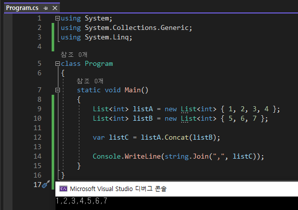Concat()을 사용할 경우 반환값으로 IEnumerable<T>를 반환하기 때문에 위에 예제들과는 차이가 있다. 반환값을 받아서 listC로 정의하였다.