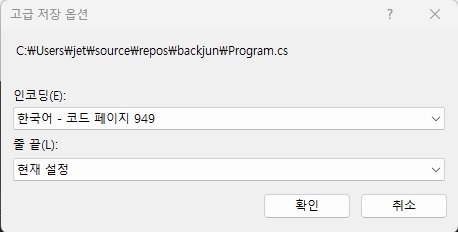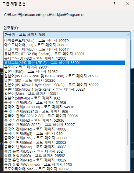 비주얼 스튜디오에서 생성한 파일은 기본적으로 CP949 인코딩의 파일이다. 아무래도 CP949는 Windows 전용 인코딩이다 보니 다른 운영체제를 사용하는 사람들과의 협업하기에 적합하지 않다. 그렇기 때문에 이를 국제 표준인 UTF-8로 변환해서 사용하는 것이 일반적이다.