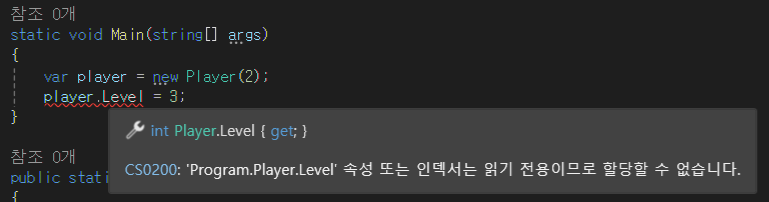 // player.Level = 10; // 초기 설정 이후 수정 불가