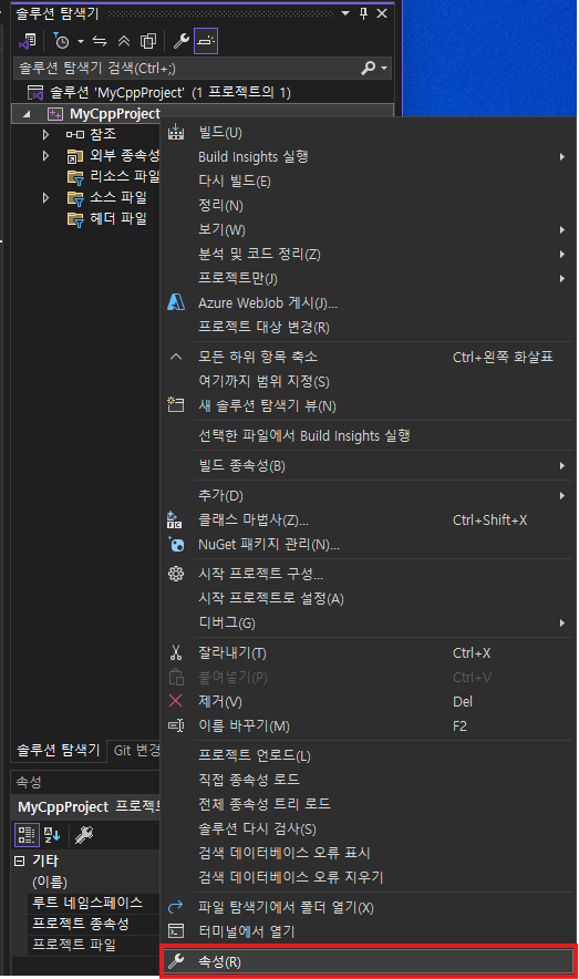 - 프로젝트 선택 후 - 마우스 오른쪽 클릭 - 속성(R) 클릭