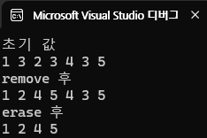 초기 값에서 std::remove()를 사용한 이후에는 3을 제외한 원소들이 앞쪽으로 이동한 것을 알 수 있다. 원소들만 재배치되었을 뿐, 컨테이너의 실제 크기는 변하지 않았다. 그리고 반환값으로 새로운 끝은 반환해서 해당 새로운 끝에서부터 컨테이너의 end()까지 제거하면 우리가 원하는 원소들만 남기는 게 가능하다.