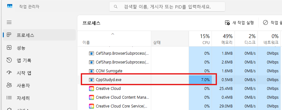 작업 관리자에서도 무한히 실행 중인 것을 확인할 수 있다.