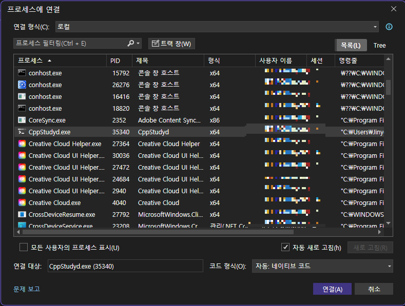 프로세스 연결에서 실행시킨 프로세스를 찾아서 클릭하면 디버깅이 가능하다.
