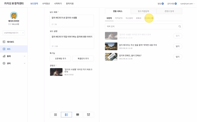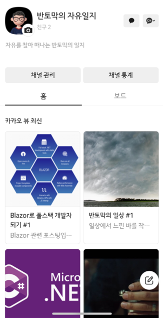 티스토리 역시 카카오에서 관리하는 서비스라서 카카오 뷰와 연동이 잘되어 있고 꾸준하게 콘텐츠 담고 보드 발행한다면 서로 좋은 시너지를 낼 수 있을 거라고 생각합니다.